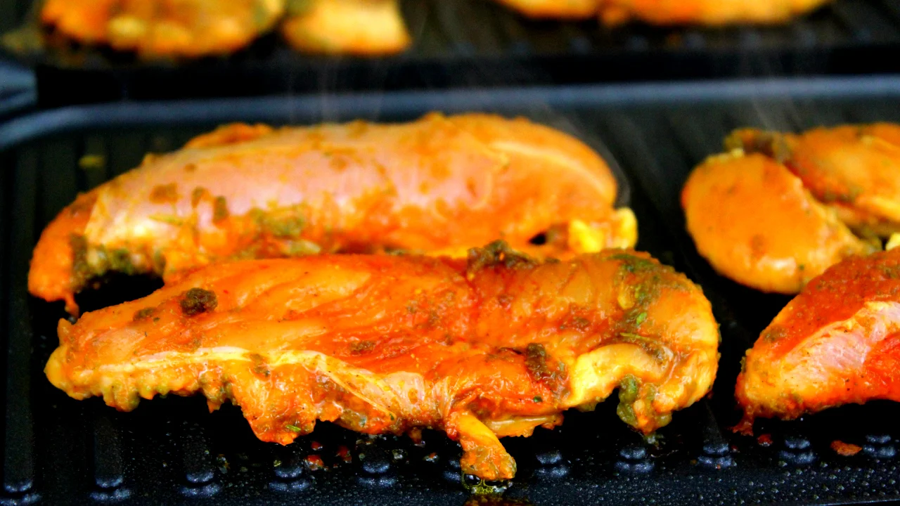 Lightly grease grill surface and add chicken.